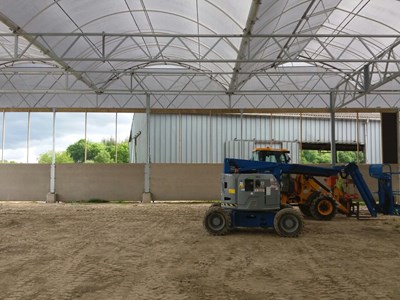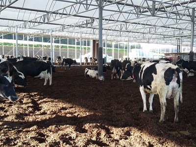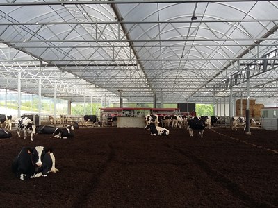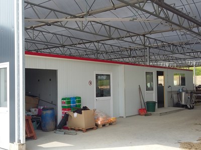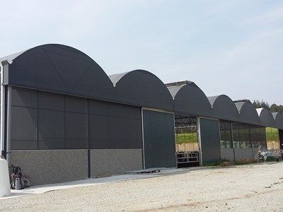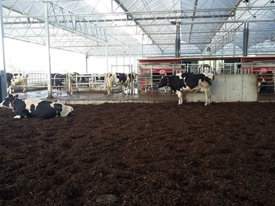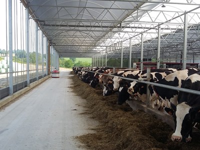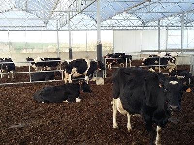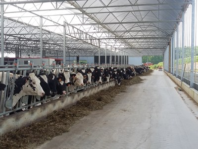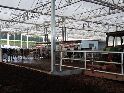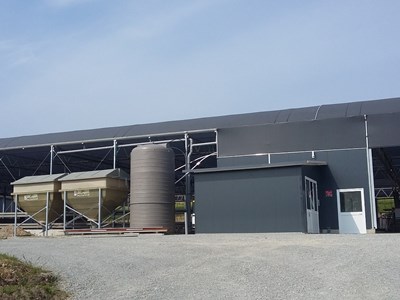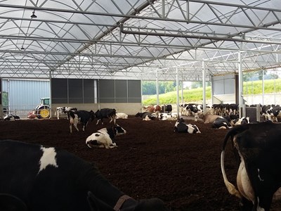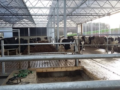 Consegnata nel 2017, questa Cow Lounge è innovativa in due modi: combina l'architettura modulare e l'illuminazione naturale di una Cow Lounge con un compost barn. Le ampie aperture nelle pareti laterali sono dotate di tende che garantiscono un'ottima ventilazione trasversale. Una delle cupole è dotata di un Move Ridge regolabile che è controllato da una stazione meteorologica. L'edificio ospita 150 vacche da latte sia in lattazione, vacche in asciutta che vitelli. Attualmente, la stalla è dotata di 2 robot di mungitura, ma è stata progettata in modo da poter ospitare in futuro un terzo robot, se necessario.